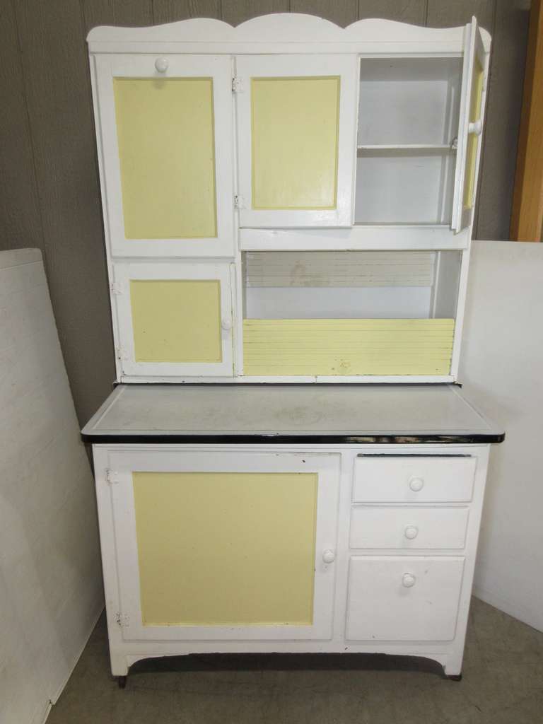 Hoosier Type Cabinet with Porcelain Slide Out Table, Flower Sifter with Cab, and Bread Compartment, Says "Gately Wiggins Co., Calumet, MI" on Back