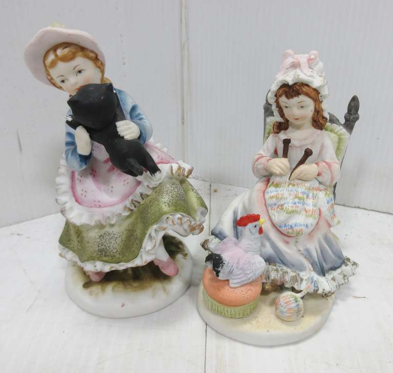 (2) Lefton Mother Goose Figurines: 1- "I Had a Little Hen", KW1473, 4"W x 4 1/2"H, Excellent; 1- "Pussycat, Pussycat", KW1474, 3"W x 4 1/2"H, Excellent