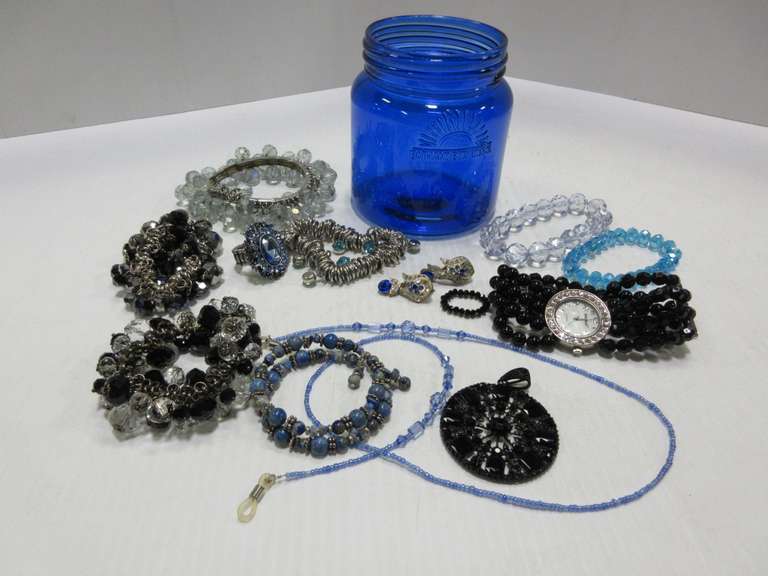 Costume Jewelry, Includes: Black Multi-Strand Watch, (2) Stretch Bracelets, Pendant, and Stretch Beaded Ring; Blue Jar Jewelry, Includes: Beaded Eyeglass Chain, Blue Cha Cha Bracelet, Turquoise Glass Bead Stretch Bracelet, Light Blue Stretch Bracelet, Industrial Loops with Turquoise Glass Stretch Bracelet, Hand Crafted Blue Denim Colored Bead Wrap Bracelet, Stretch Ring, and Pair of Blue Post Earrings