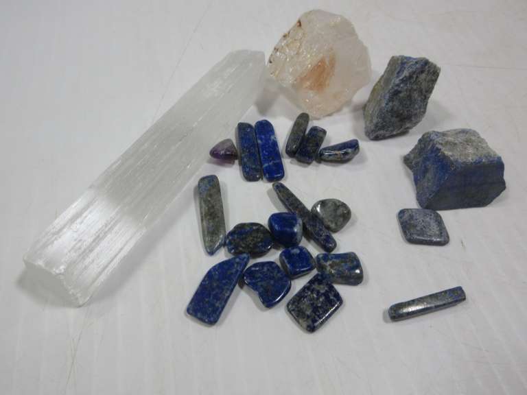 Mineral/Gems, Include: 26g Amethyst Crystal Sphere Ball, Hexagonal Columnar Pink Fluorescent Calcite Cluster, 2.4 oz. Pink Mangano Calcite with Hematite Crystal Egg, Yellow Calcite Cluster, Azurite, Jasper Carved and Polish Heart, and One Unknown Heart