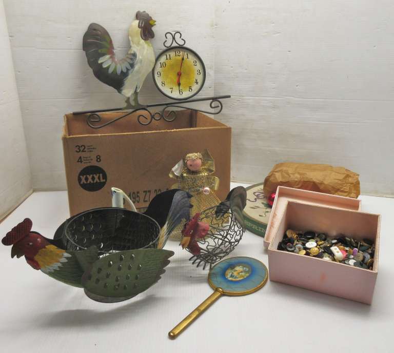 (2) Chicken Metal Baskets, Chicken Clock, and Old Buttons