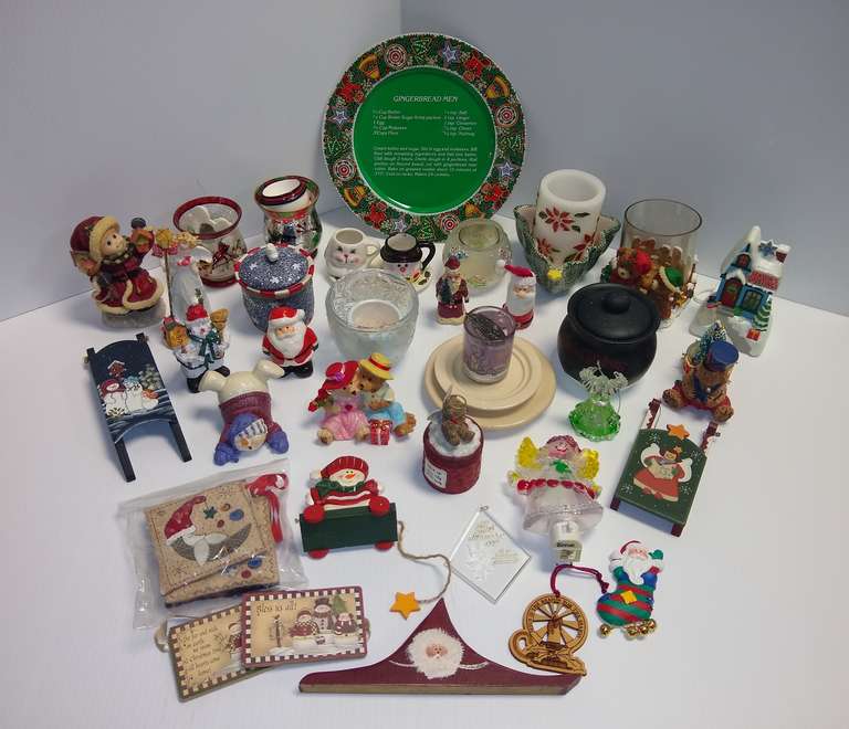 Christmas Ornaments and Decorations: Wood and Resin Painted Santa Figures; (3) Copper Watering Can Ornaments, NIB; Ceramic Hand Painted Ornaments; Trees; Snowman; Macrame Tree; (2) Mickey Mouse Wood Ornaments; Angels, Made in Mexico