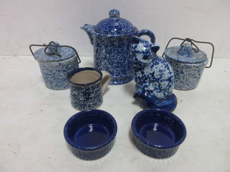 (7) Misc. Pieces of Speckled Blue, Marking on Teapot, "Quality Product Made in Britain"