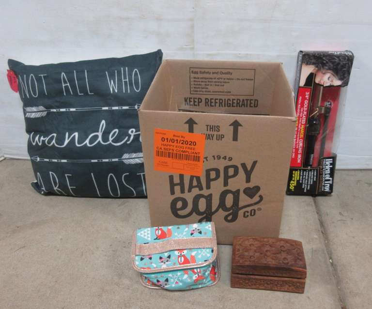 Pillow, Makeup Case, Small Fox Makeup Case, Jewelry, Curling Iron, and a Carved Wooden Box