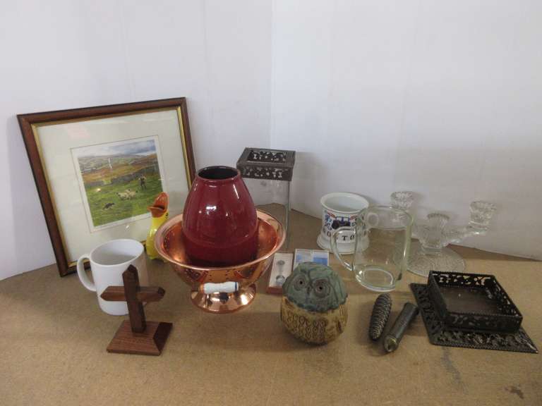 Framed Art by Andrew Hutchinson, Square Glass/Metal Candle Holder, Ceramic Vase, Tapered Glass Candle Holder, (2) Coffee Cups, (3) Collector Spoons, Whistle Duck Teapot, (2) Brass Clock Weights, Owl Bank without Plug, Glass Mug, Copper Colander, and a Wooden Cross
