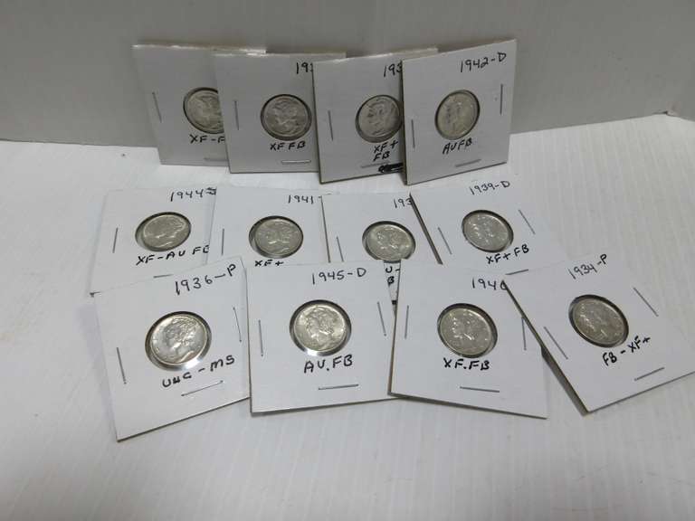 (12) Mercury Dimes: 1934-P, XF FB; 1935-P, AU to UNC; 1936-P, UNC MS; 1937-P, XF FB; 1939-D, XF FB; 1939-P, XF FB; 1940-P, XF FB; 1941-P, XF; 1942-D, AU to FB; 1943-D, XF FB; 1944-P, AU to FB; 1945-D, AU