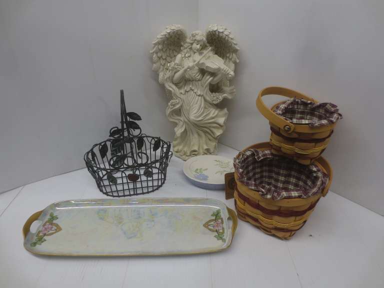 DF Hitched/Bavaria Platter, 23" x 17" x 6"; Angel Statue, 15"; Hand Painted Soap Dish; (2) Boyd Bear Baskets, 5" and 7"Dia; Wire Apple Bushel