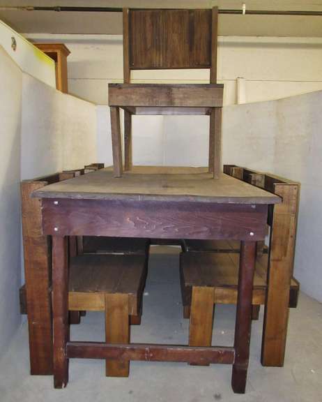 Refinished Table, 31" x 72" x 29 1/2", Solid Wood; Large Chair, Reclaimed Solid Wood, 22" x 22" x 38"H; Small Chairs, Reclaimed Solid Wood, 17", 17 1/4", and 29"H, Seats- 14"H