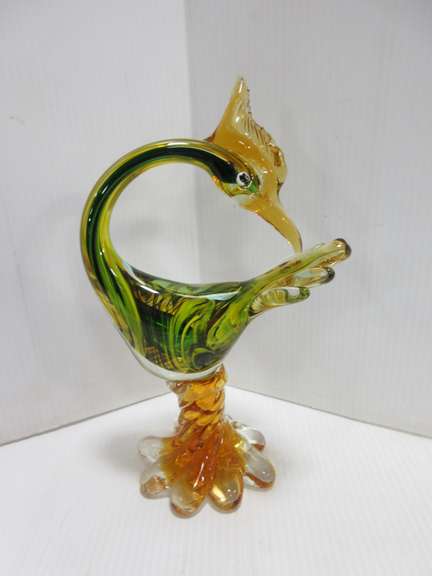 Handmade Green with Gold Trim and Gold Speck Crystal Base Bird Figure