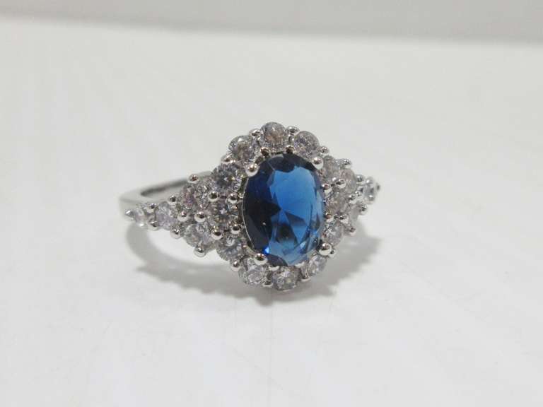 Size 8 Silver Ring with Clusters of Zirconias and Man Made Sapphire Stone