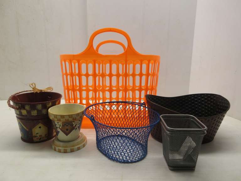 Orange Basket with Blue Handle Basket, Bird House Pail, Candle Holder, and (2) Pencil Holders, Various Sizes