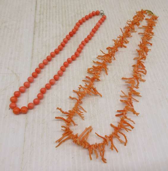 (2) Older Coral Necklaces: 1- Undyed Natural Salmon Orange Coral Bead Necklace, .925 Clasp, 19"L, 38.9g, Knotted After Each Bead; 1- Natural Pink/Salmon Colored Branch Coral with Gold Clasp, 24"L