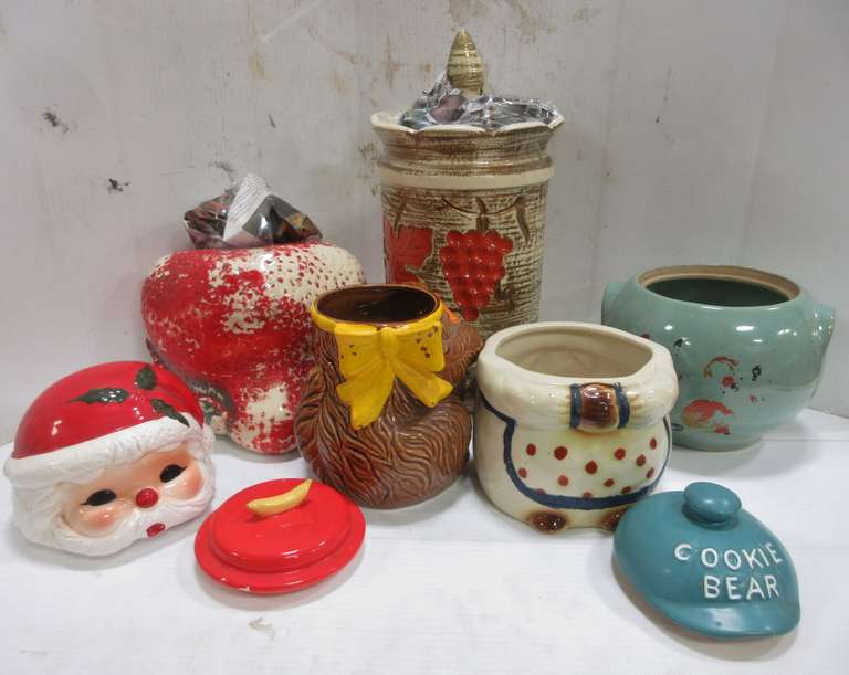 (2) Older Cookie Jars, with Extra Lids and Bottom, Include: 1- USA Strawberry, Some Paint Loss; 1- Tall 12" Cookie Jar, Great; 3- Various Lids and 3- Various Bottoms
