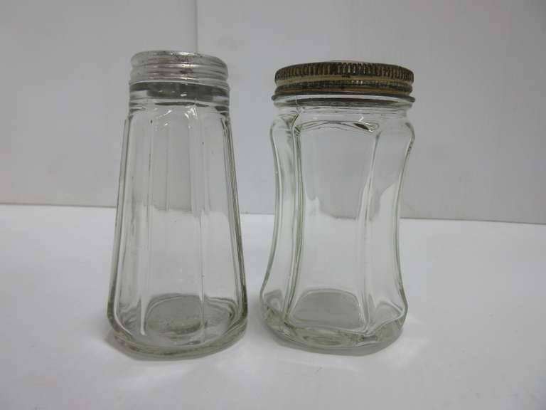 (2) Old Glass Salt Shakers with Metal Caps, Possibly Darna Glass and 4K, Both Numbered