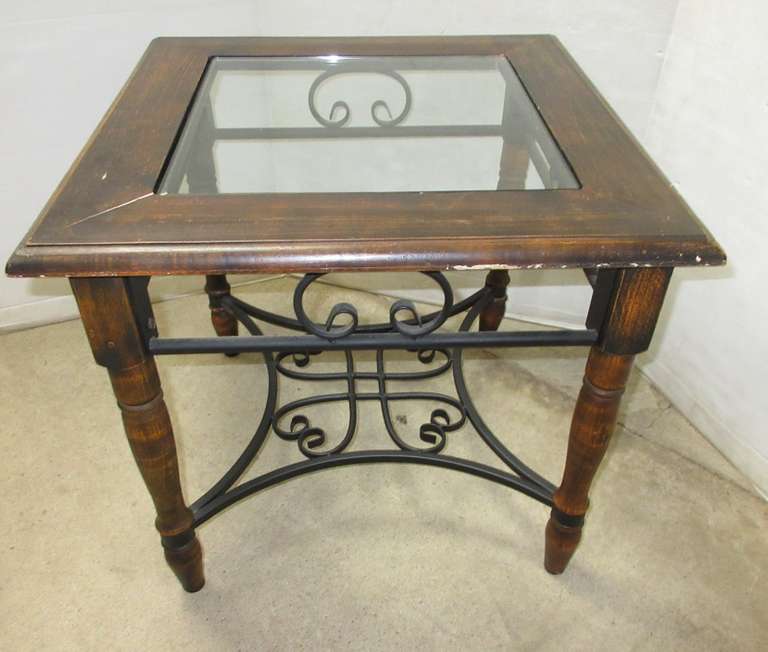 Antique Square Wooden Table with Glass Insert, Wrought Iron Base