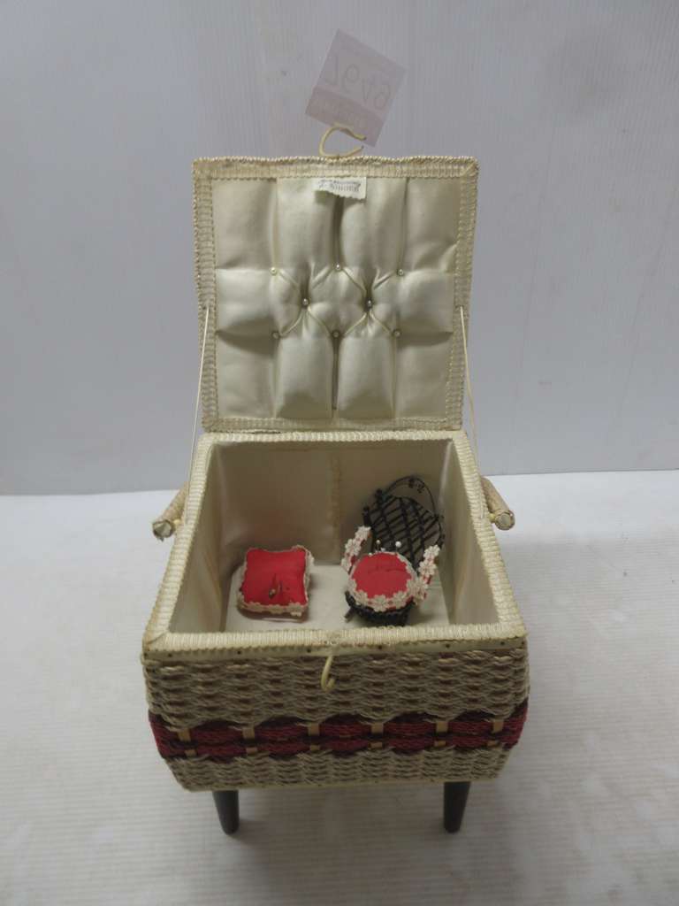 Singer Sewing Box Stand with Some Spotting on Inside, 12" x 10 1/2" x 10 1/2", Clasp has Wear; Rocking Chair Pin Cushion and Square Pin Cushion