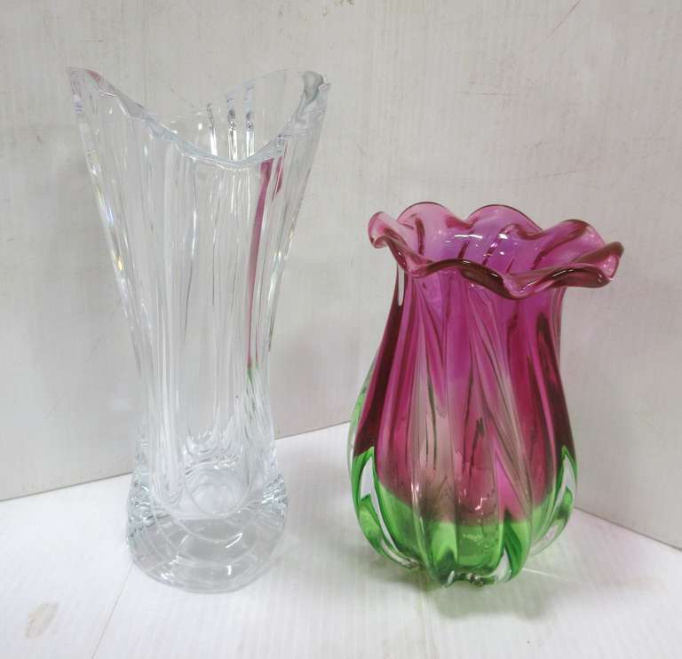 Lead Crystal Vase, 10"H; Green and Cranberry Swirl Vase, 7 1/2"H