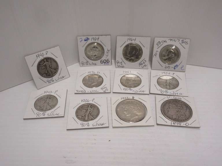 (4) 1964 Washington Quarters, 1964 and 1976-D Kennedy Half Dollars, 1951 Franklin Half Dollar, 1934, 1936, 1940, and 1943 Walking Liberty Half Dollars, 1922-D Peace Dollar, and an 1899-O Morgan Dollar