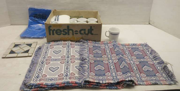 (9) Corning Ware Coffee Cups with Blue Rim, Made in USA; (6) Blue and White Cloth Placemats; (6) Blue and White Placemats with Hearts; (4) Blue and White Placemats; (2) Blue Table Covers; Hot Pan Holder
