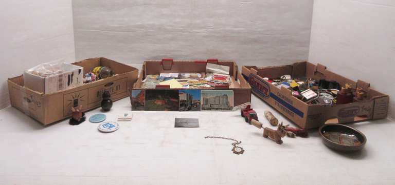 (3) Tray Flats with Hundreds of Antique Small Items, Include: Buttons, Patches, Photos, Postcards, Watches, Keys, Medals, Pens, Matchbooks, Corks, and More, Various Sizes and Conditions