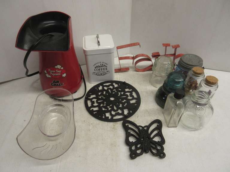 Misc. Kitchen Items, Include: Air Popcorn Popper, Works; Coffee Tin; (2) Antique Insulators; (5) Jars of Various Types; (2) Black Trivets; Family Metal Sign