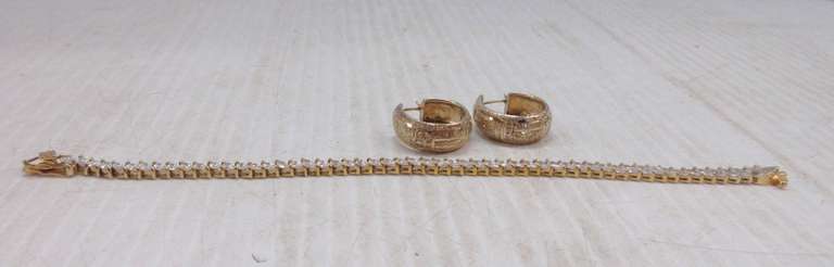 Sterling Vermeil Bracelet and Hoop Style Earrings, Bracelet Has Marquis Cut CZs, Double Safety Clasp Earrings, Textured Geometric Design Stamped and Hallmarked