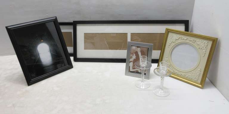 (5) Frames: 2- Long Black Wood; 1- Hallmark, New; 2- Small; (2) Candleholders