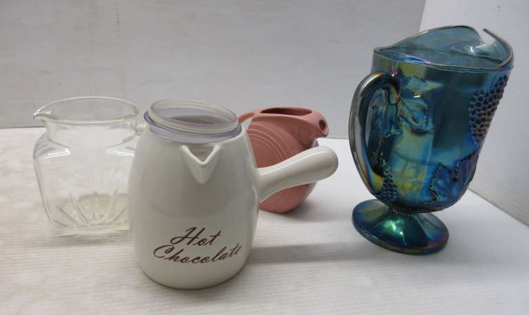Old Indiana Carnival Glass Iridescent Blue, Harvest Grape Pitcher, 10"H, Excellent; Fiesta Rose Pink Pitcher, Excellent; Hot Chocolate Glass Pitcher, Excellent; Old Small Glass Pitcher, Excellent
