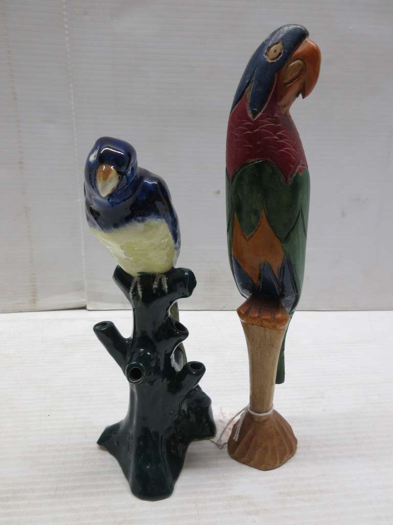Hand Carved Wood Parrot and Colorful Ceramic Parrot Statue