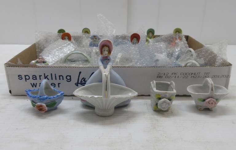 (19) Ceramic Pieces, Include: Girls with Baskets, Includes One Boy and Various Decorated Baskets, All are From the 1950s