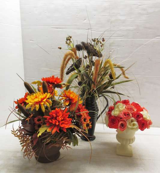 (3) Floral Decor Arrangements: 1- Bronze Finish Base, 1- Flowers, and 1- Multi