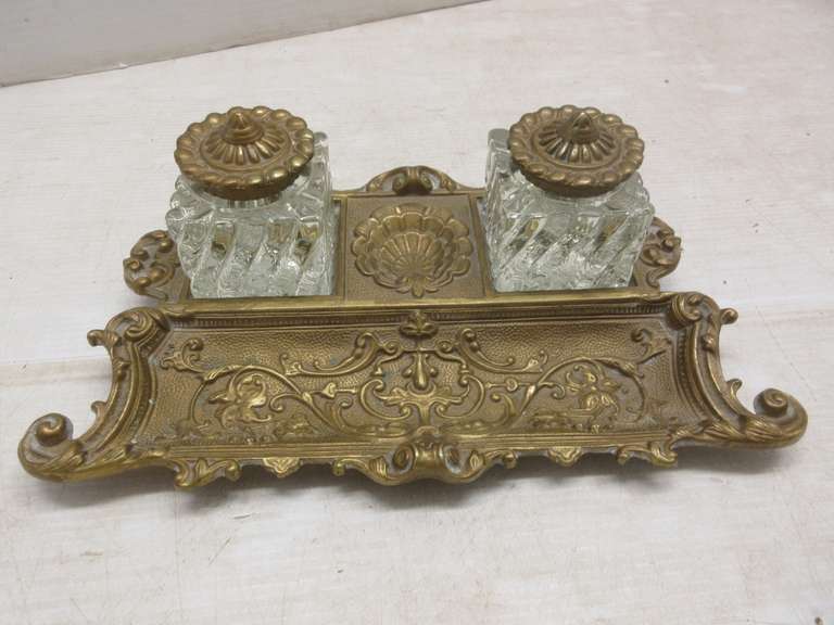 Original Virginia Metalcrafters Art Nouveau Brass Double Inkwell Desk Set, Very Ornate Design