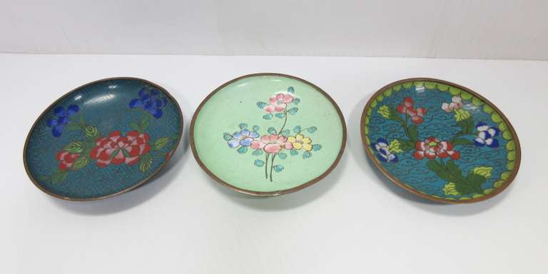 (3) Older Chinese Cloisonne Turquoise Dishes with Flowers