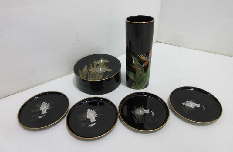 Otagiri Black Vase, "Birds of Paradise" Japan Floral; Old Black Lacquer Iris Design Box with (4) Coasters