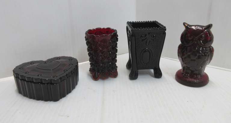 Ruby Glass Owl Paperweight, 4"; Fenton Ruby Carnival Glass Toothpick Holder, 3 1/4"H; Avon Cape Cod Ruby Heart Trinket Box; Black Milk Glass Spill Vase