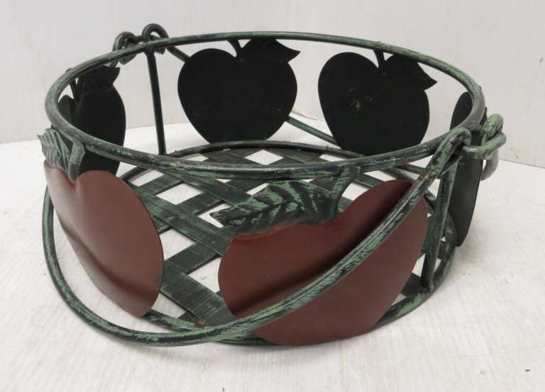 Green Metal Basket with Handle and Red Metal Apples on the Side