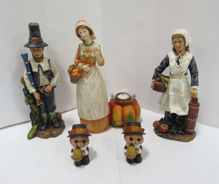 (5) Thanksgiving Figurines: Pair of Pilgrim Man and Woman, 9"H; Pilgrim Woman with Glass Votive Candle Attached Sitting in a Pumpkin, 10"H; Pair of Pilgrim Squirrel Salt and Pepper Shakers, 3"H