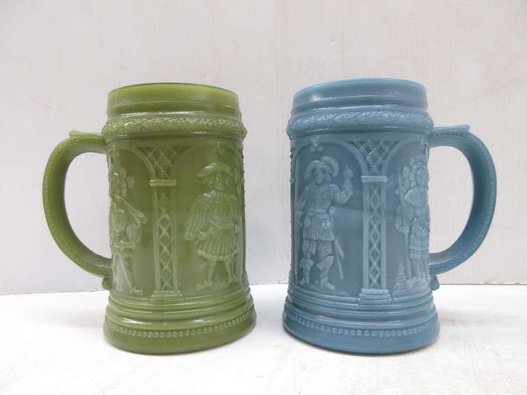 Westmoreland Knights Custard Glass Mugs, and Early American Pattern Steins: Green, and Blue in Color