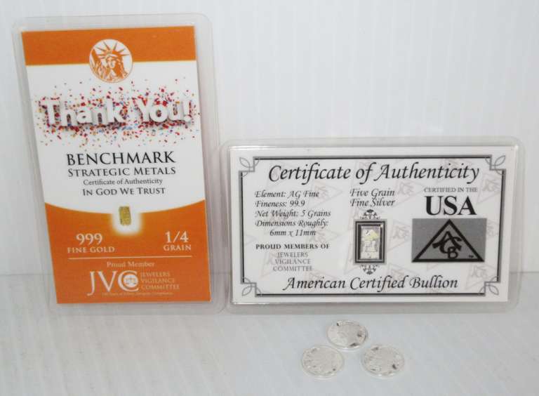 1/4 Grain of Pure Gold, Benchmark; 5 Grains of Pure Silver; (3) 1g Silver Rounds
