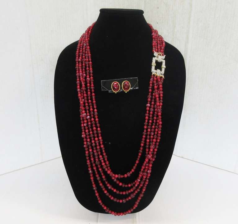 Les Bernard for Bonwit Teller, Original Tags, Multi-Strand Necklace, and Matching Clip on Earrings, All Signed: Opera Length Necklace with Gold Plated Clasp Covered in Swarovski Crystals, Shaped Red Lucite Beads with Swirls of Pinks; Earrings are Gold-Plated, Circa 1960's or Earlier, 38"L, Drop on Earrings- 1", Jewelry Display Not Included