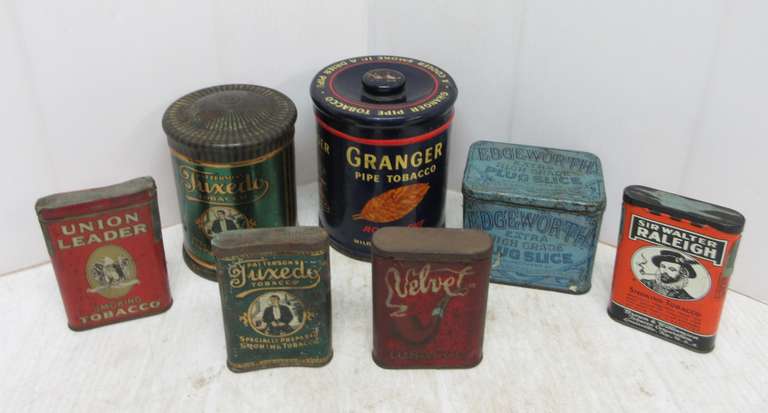 Tobacco Tins: Granger, Tuxedo, Edgeworth, Union Leader, Velvet, and Sir Walter Raleigh, Various Sizes