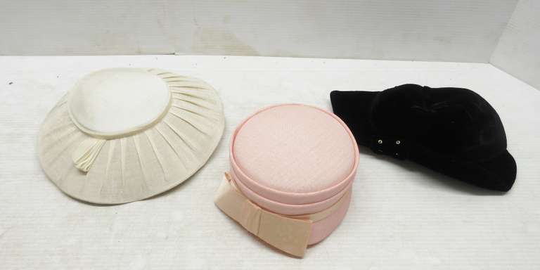 (3) Antique Women's Hats in Federal's Dept. Store Box: 1- Black Velvet with Silver Studs, 1- Pink with Satin Bow, and 1- Cream with Tucks and Satin Ribbon