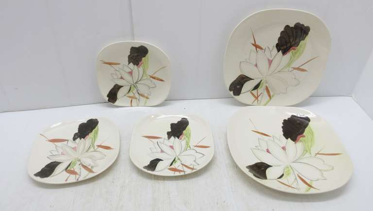 (5) Red Wing Pottery Dinnerware Plates, Lotus Pattern, Made in Late 1940s to 1957, All Marked Red Wing on Back