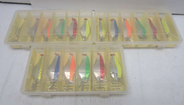 (3) Six-Compartment Plano Tackle Boxes, and (18) 3/8 oz. Fishing Lures