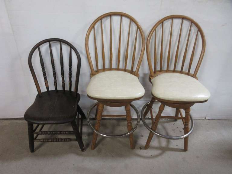 (2) Oak Bar Stools with Cream Colored Leather Cushions, 24"H to Seat; Antique Wooden Chair, Black in Color, 19"H to Seat