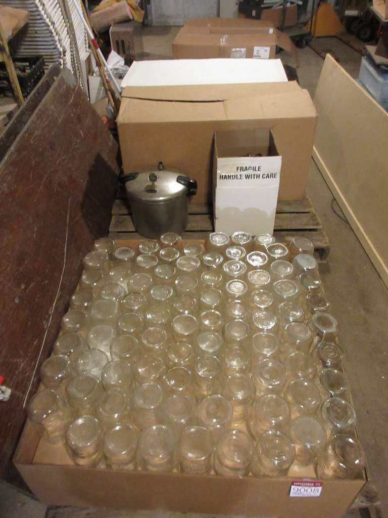 (4) Pallets of Canning Supplies, Including: (3) Pressure Cookers, Three-Piece Stainless Stock Pots with Lids, Cherry Pitters, Grinders, Peelers, Sives, Funnels, Over (300) Large and Small Mouth Quart Size Jars, Over (70) Large and Small Mouth Pint Size Jars, Over (50) Large and Small Mouth Half Pint Jars, Jelly Jars, One-Gallon Jar, (2) Quart Jars, and Lid Rings