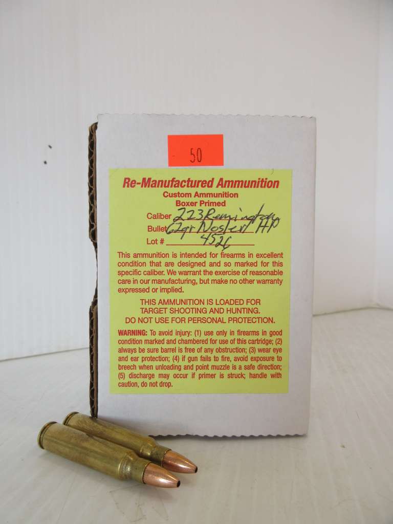 (50) Rounds of 223 Remington Loaded with 62-Grain Nosler Hollow Point, Remanufactured Ammunition y Jerrys Guns and Reloading LLC, Jerry's Guns and Reloading LLC has Licensing and Insurance on File with Albrecht Auction and is Authorized to Sell this Custom Ammo Lot