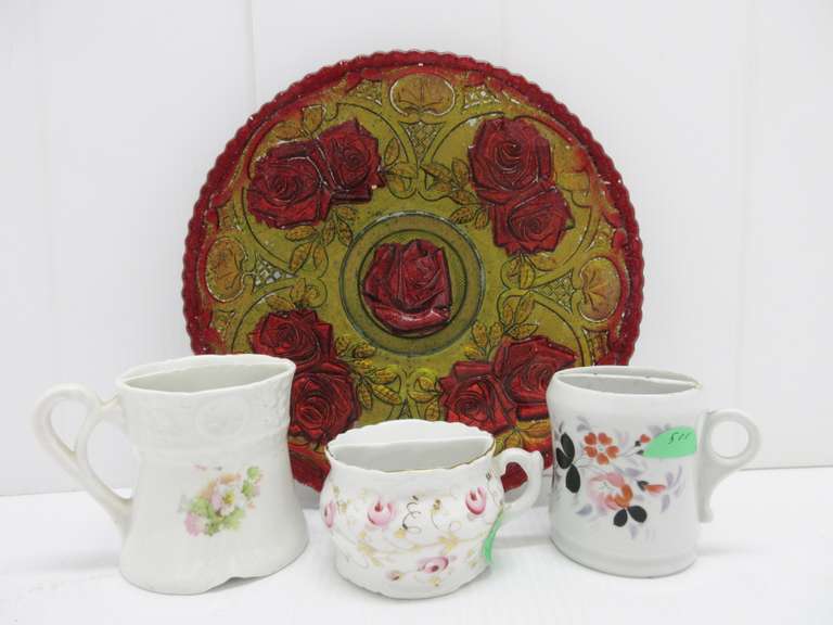 (3) Mustache Cups, and 12" Carnival Glass Plate