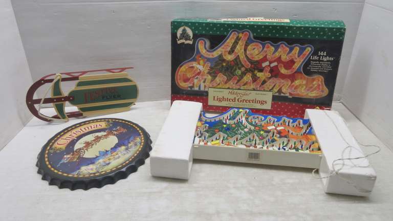 Hallmark Festive Flyer Sled; Bottle Cap Christmas Metal Wall Art; Older Merry Christmas Lighted Marquee Sign with 144 Lights in Box, Works Great