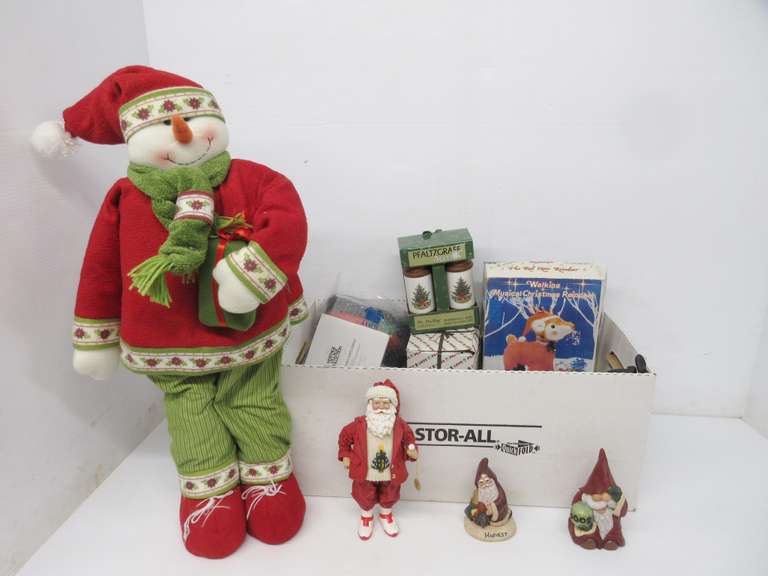 Christmas Items, Includes: Large Snowman, Rudolph, Santa Figures, Avon Snowman, Mr. Top Hat, Pfaltzgraff Mr. Dudley Salt and Pepper Shakers, House of Lloyd Angelic Trio Figure, and Christmas Ornaments